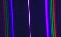 LINIENSPEKTRUM DES WASSERSTOFFSHier sieht man die spektrale Verteilung, aufgenommen durch ein Strichgitter mit 3000 Linien pro cm. In der Mitte erkennt man die Farbe, mit der das menschliche Auge das Licht der Röhre wahrnimmt. Auf beiden Seiten angeordnet das Maximum 1. Ordnung.