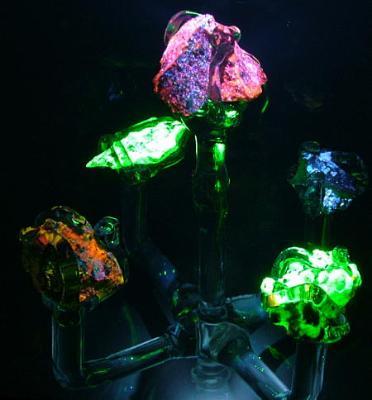Darüber hinaus fertigen wir aber auch noch kleinere Röhren, sogenannte "U-Boot-Röhren", die mit Mineralien gefüllt sind und, je nach Füllung, in unterschiedlichen Farben fluoreszieren.
