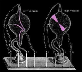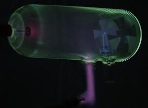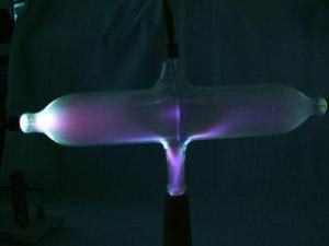 Gasentladungsröhren mit unterschiedlichem Vakuum können einen Elektronenstrahl nachhaltig beeinflussen. Bei diesen beiden Röhren wird der Strahl bei niedrigem Vakuum immer zur nächstgelegenen Anode gezogen. Bei hohem Vakuum dagegen trifft er immer auf die gegenüberliegende Wandseite.