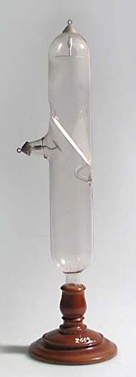 Die Kathodenstrahlröhre nach Crookes.... hier im spannungslosen Zustand, dient dem Nachweis der Ablenkbarkeit von Elektronenstrahlen durch ein Magnetfeld.