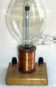 Hier die Röhre mit variablem Elektrodenabstand. Eine der beiden Elektroden ist aus Stahl und läßt sich mit einem Magneten von außen verschieben.