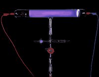 Kanalstrahlröhre nach Goldstein..... erzeugen positiv geladene Teilchenstrahlung, die von Goldstein als Kanalstrahlen bezeichnet wurden. Durch eine Schlitzblende werden hier parallel verlaufende violette Lichtbündel erzeugt.