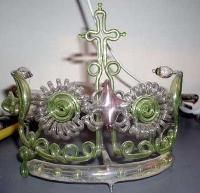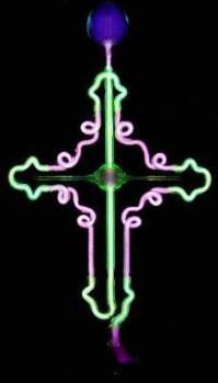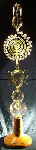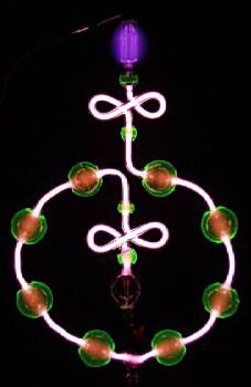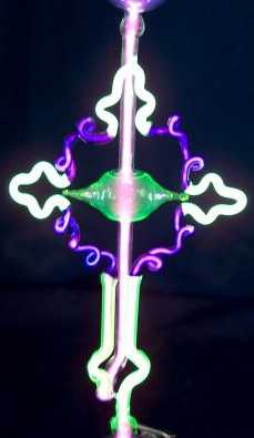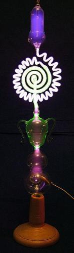 Hier mit angelegter Hochspannung. Deutlich sieht man die unterschiedlichen Farbschichtungen im Inneren der Spirale im Vergleich zu der "Schnecke", die auch hier wieder aus Uranglas gefertigt ist.