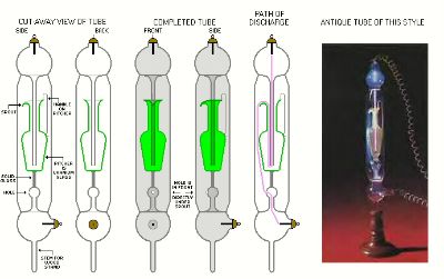 Besonders schön ist hier der Werdegang einer Röhrenfertigung zu sehen. Der Elektronenstrahl tritt von unten (negativer Pol) durch eine kleine Öffnung in der Glaskugel in den Innenraum der Röhre, kann dort aber nicht direkt zum positiven Pol gelangen, da der Krug (pitcher) unten verschlossen ist. So muß der Strahl den Umweg in das Innere des Kruges wählen.