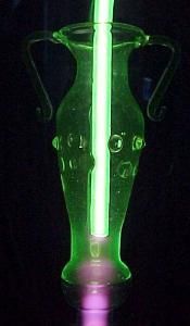 Hier ist sie in einer anderen Perspektive zu sehen. Im verdunkelten Raum ist gut der Elektronenstrahl zu sehen, der hier durch die griechische Amphore aus Uranglas besonders gut zur Geltung kommt.